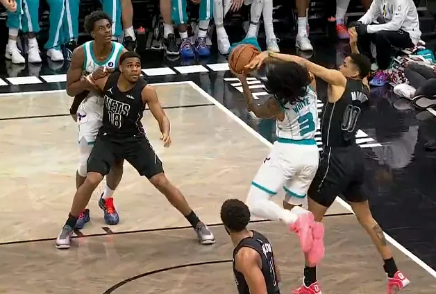 第四节比赛中,米诺特防守下压直接打到怀特面部,裁判回看吹罚一级恶意。